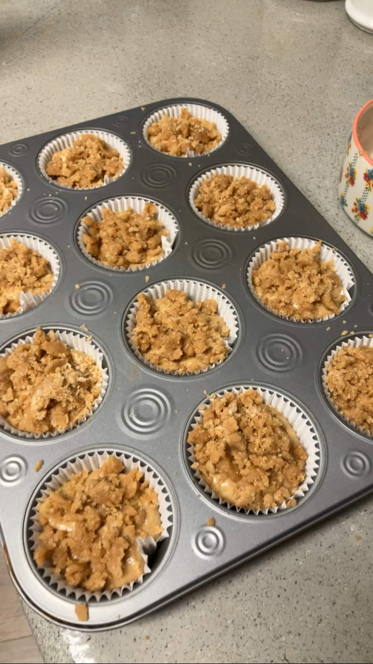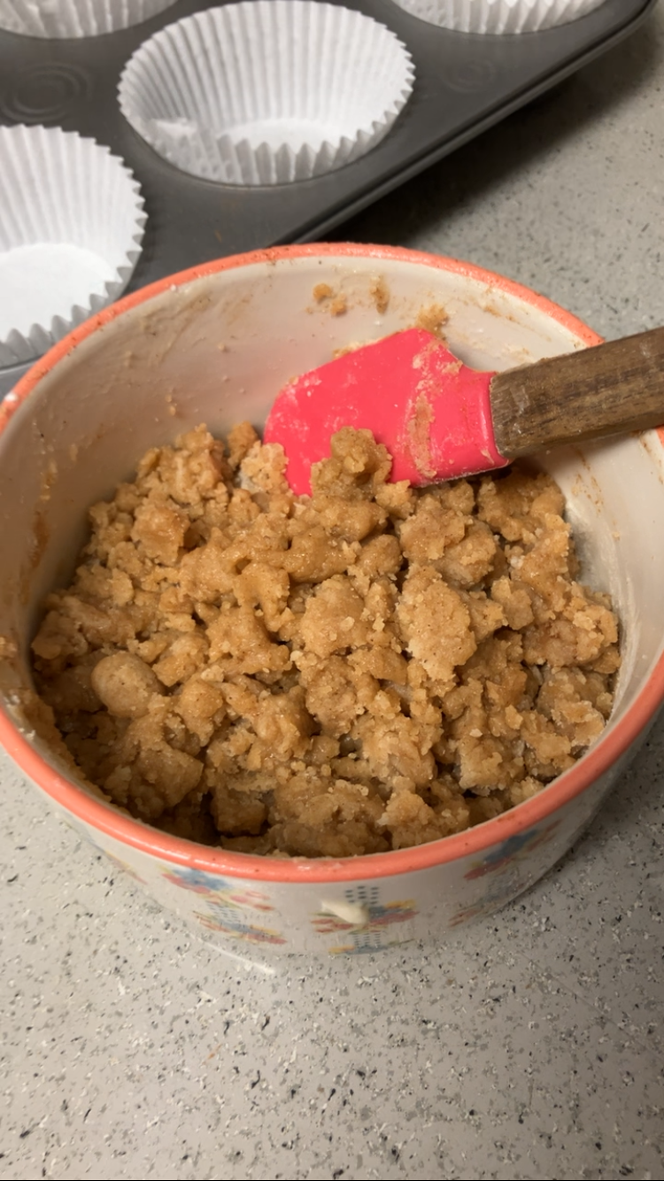 For this part I use an unmeasured amount of melted Salted Butter, Flour, Brown Sugar, Cinnamon and Apple Pie Spice. The main thing you want is that crumbly consistency, if you make a little more than necessary that is okay! load those muffin tops up! its seriously the BEST.