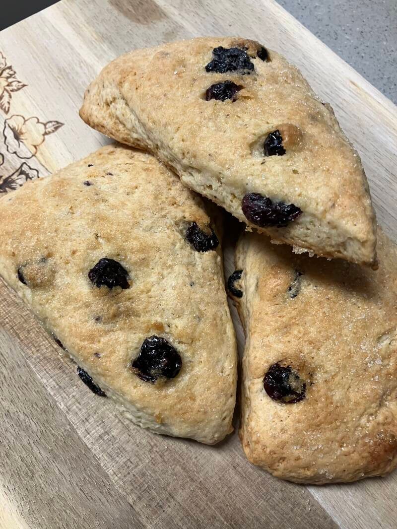 Place the scones on a parchment covered cookie sheet and bake for 10 minutes. When the time is up rotate the pan and bake for an additional 10 to 12 minutes. You want them to have a lightly golden color.